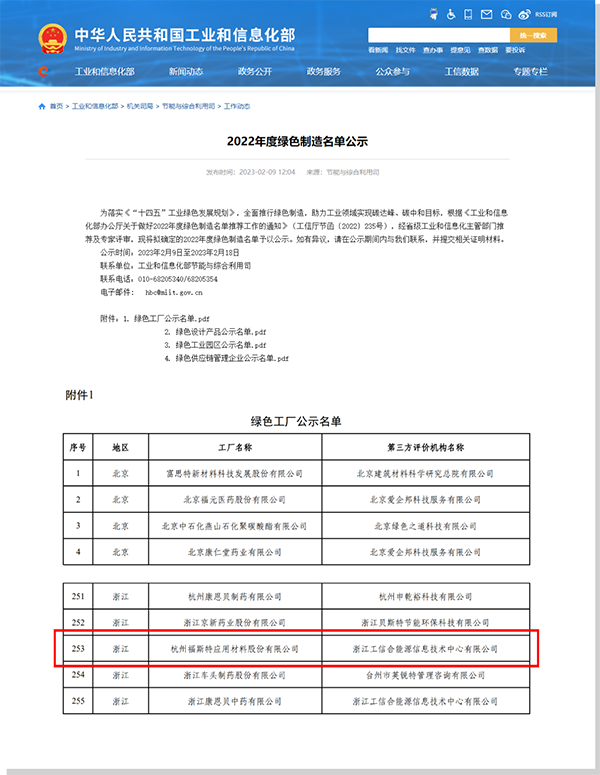 2023年2月9日,工業和信息化部網站公示了2022年度綠色制造名單,杭州福斯特應用材料股份有限公司國家綠色工廠獲工信部公示。