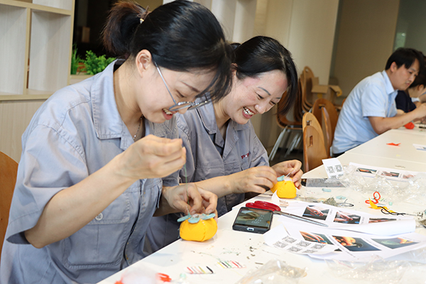 萋萋苦艾納香囊,傳承千年未泯香。我國自古就有端午佩戴香囊的傳統,清香的艾葉有避邪驅瘟、醒腦提神的功效,也有“招百?!钡拿篮迷⒁?。員工們自己動手縫制柿子形狀的香囊,象征“柿柿如意”,大家全神貫注,穿線、縫制、收口、定型,一個個可愛的小柿子就在手中誕生了。