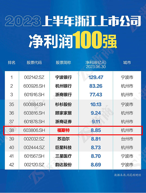 此外,福斯特上半年實現凈利潤8.85億元,位列浙江上市企業凈利潤百強榜單第38名!營業收入與凈利潤雙雙躋身榜單前40名,有效提振了公司發展的信心。