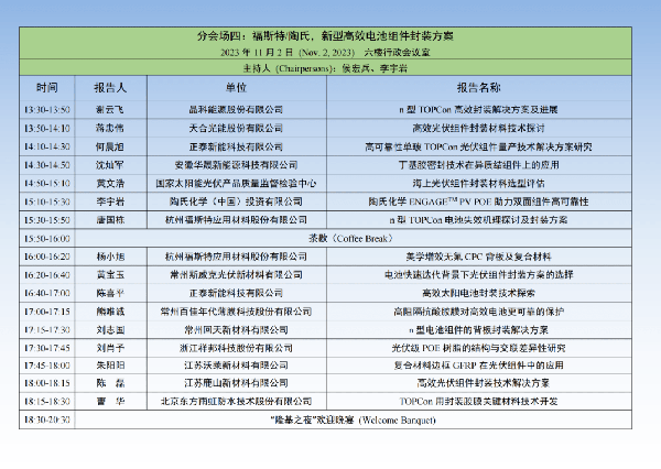 同時福斯特作為CSPV協辦單位,將于11月2號下午組織關于封裝方案的專題論壇。分會場四:福斯特/陶氏,新型高效電池組件封裝方案,和行業同仁探討行業技術對封裝方案的要求。